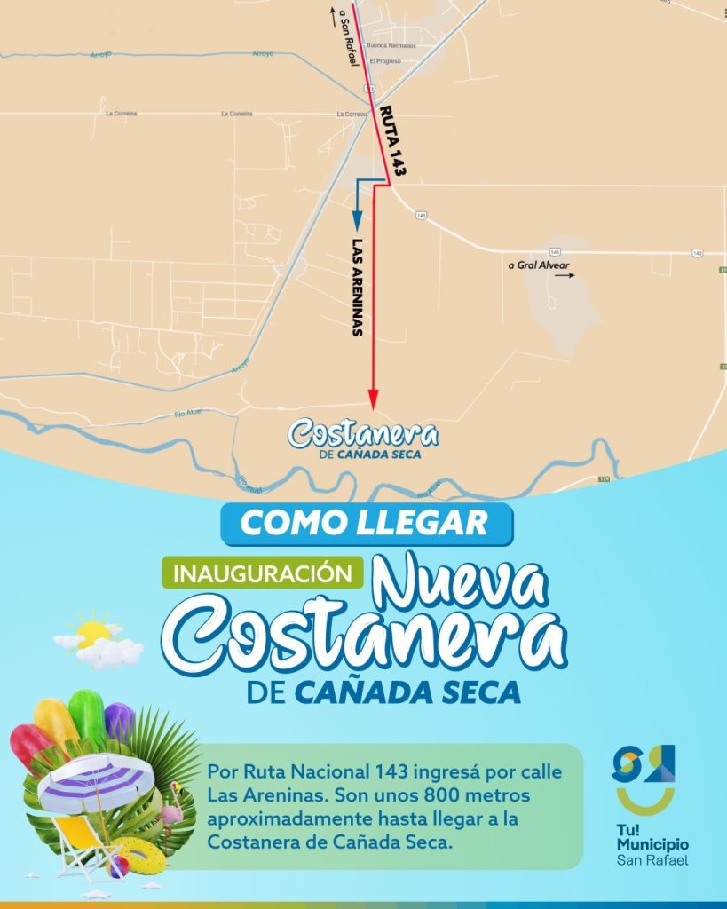 La costanera está justo en la zona limítrofe de Cañada Seca y Las Malvinas. Se encuentra unos metros del casco urbano de Salto de las Rosas y apenas a 15 minutos de la Ciudad de San Rafael.