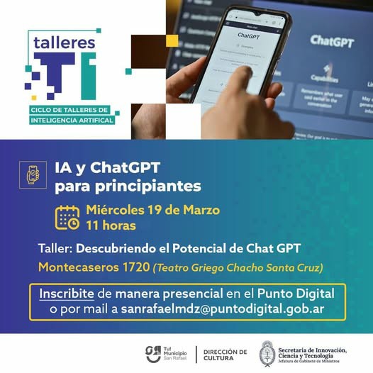 Desde Punto Digital invitan a participar de un taller para principiantes, que tiene la particularidad de ser gratuito y que está orientado a temas modernos como son la Inteligencia Artificial (IA) y Chat GPT (del inglés Chat Generative Pre-Trained). La titular de esa institución, Lorena Romani, adelantó algunos detalles en diálogo con FM Vos (94.5) y con Diario San Rafael.