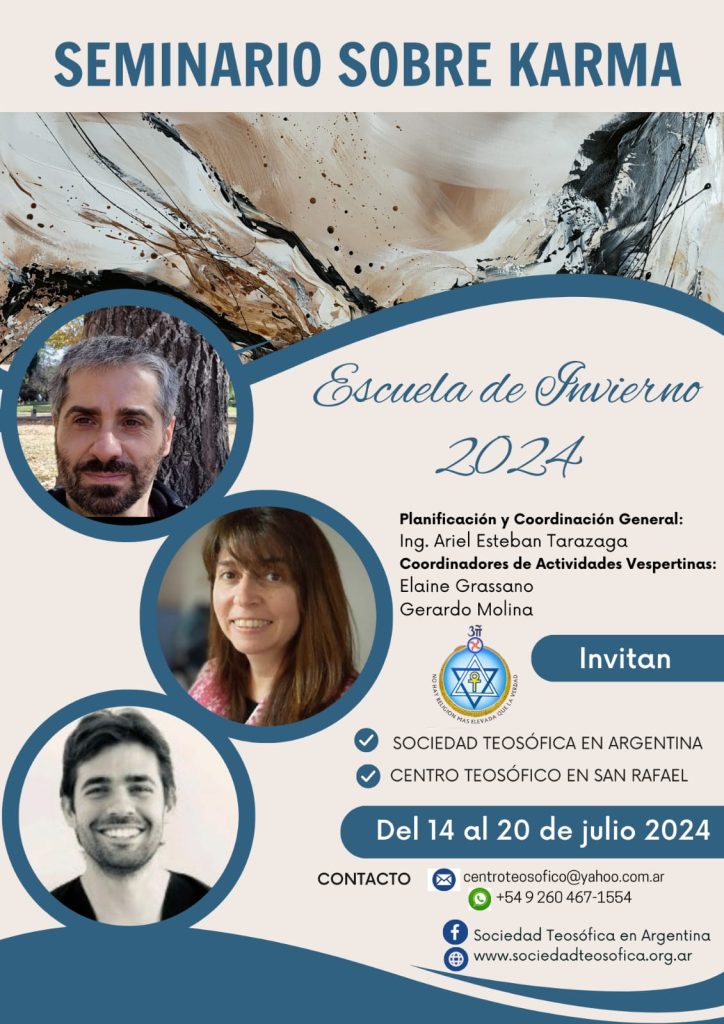 A partir del domingo 14 de julio, tendrá lugar un seminario sobre el karma en el centro teosófico, ubicado casi en el cruce de las calles Zamarbide y San Francisco, del distrito Las Paredes. La apertura será en la tarde del domingo y se extenderá durante varios días hasta la mañana del sábado 20 de julio, con actividades en las mañanas y en las tardes. “En la mañana expondrá Daniel Ariel Tarasaga, que es doctor en Física, pero que a su vez es un estudioso de la Filosofía, de religiones comparadas. En la mañana coordina él y expone él; luego se presentan preguntas, temas, trabajos grupales; y a la tarde, a partir de las 17.30, se harán grupos de debate y además va a estar apoyado por temas afines por Elaine Grassano, que es analista de sistemas y que actualmente –a pesar de que es una adulta-joven– se anotó en astronomía”, adelantó. También se presentará Gerardo Morales, un joven sanjuanino que se ha dedicado a la medicina alternativa, medicina natural, kinesiología, etcétera.