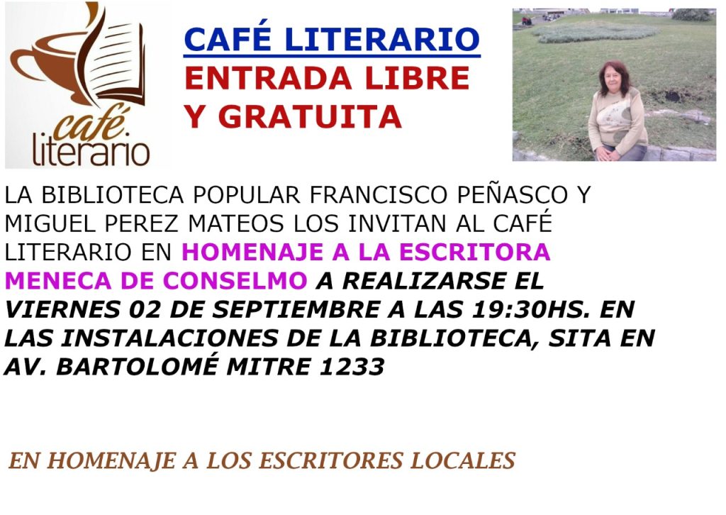 La biblioteca Francisco Peñasco (avenida Mitre 1233) vuelve a ser el punto de encuentro de un café literario, con entrada libre y gratuita. Será el viernes 2 de septiembre desde las 19.30. “La idea es la dinámica que siempre utilizamos, que es hablar de la escritora o del escritor que ha sido seleccionado”, dijo y recordó que “Meneca” de Conselmo fue una docente y escritora que si bien nació en Huinca Renancó, Córdoba, vivió en el departamento desde pequeña.