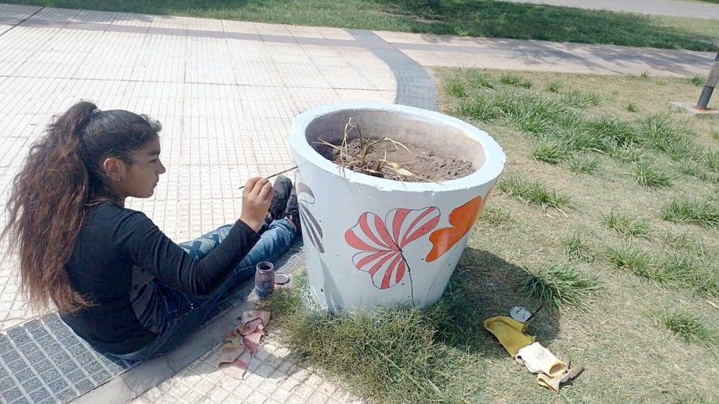 Específicamente, los chicos intervinieron decorando macetones de alrededor de un metro de altura, que están colocados en el paseo. “Estaban pintados en un color amarillo ocre, entonces fue mi propuesta decirle al delegado, Ramón Pérez, y también a Alejandro Montoya (que está encargado del mantenimiento del paseo), que podría ir con mis alumnos del taller. Si ellos pintaban de blanco los macetones, nosotros podíamos intervenir dibujando y pintándolos para darles más ‘alegría’”, destacó.