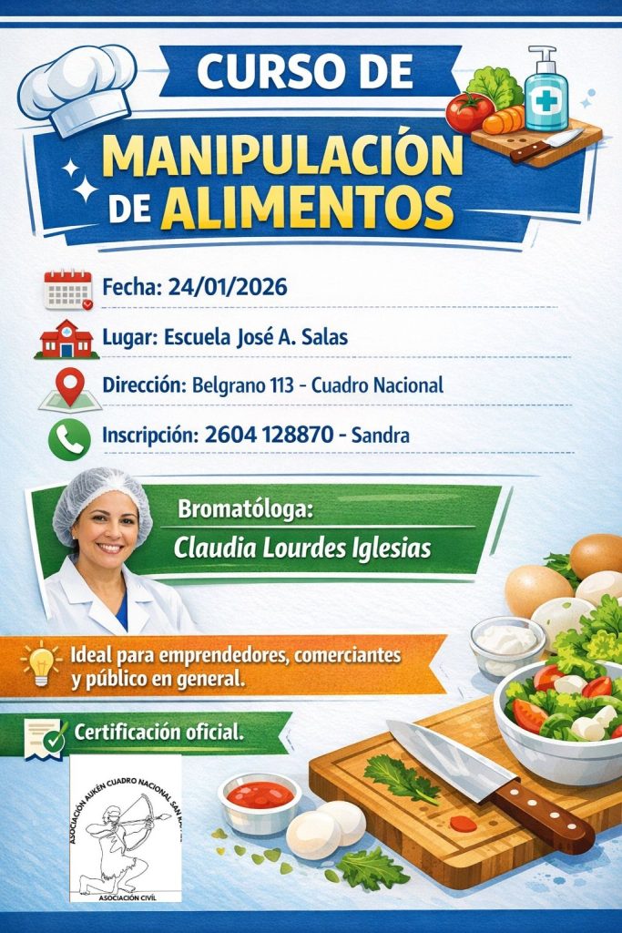 Tras la edición realizada a principios de diciembre con la participación de la bromatóloga Claudia Iglesias, la asociación repetirá la capacitación el sábado 24 de enero en la escuela Nº 1-101 Comandante Salas (Belgrano 113, Cuadro Nacional). “Nuevamente será la bromatóloga Claudia Iglesias quien dictará el curso, de 8:30 a 12:30”, señaló Salinas, y destacó que el carnet que recibirá el participante lo habilitará para trabajar por tres años.