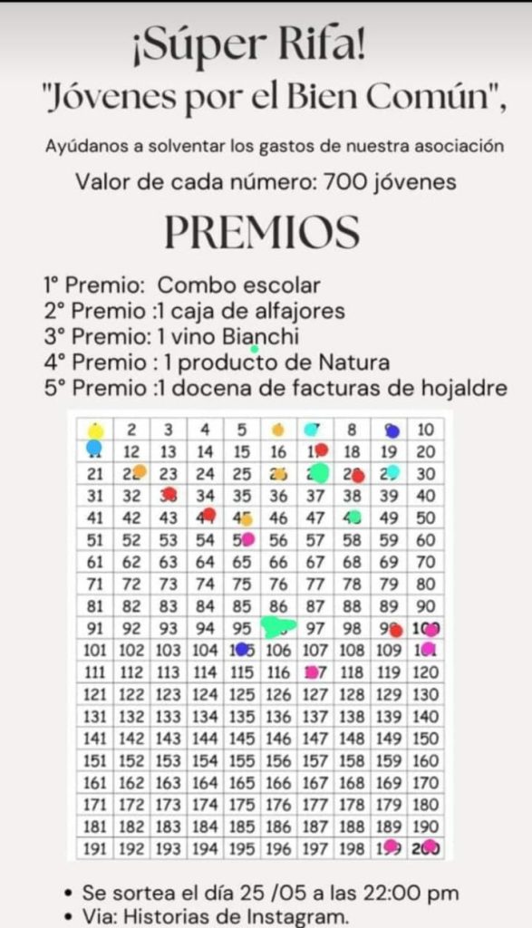 Debido a que se trata de jóvenes que no cuentan con demasiados recursos, pero que están con toda la energía para seguir ayudando al prójimo, buscan reflotar la situación a través de una rifa, en este caso, ya que necesitan regularizar una situación económica interna. “Lo que estamos haciendo es una ‘súper-rifa’, con premios que la verdad es que vienen muy bien, como es el premio mayor (que es el que más llama la atención), y que es combo de útiles que incluye una resma de hojas, dos juegos maped (que vienen completos para geometría, álgebra y demás)”, adelantó. El segundo premio será una caja de alfajores; el tercero es un vino Bianchi; el cuarto un producto de cosmética; y el quinto, una docena de facturas.