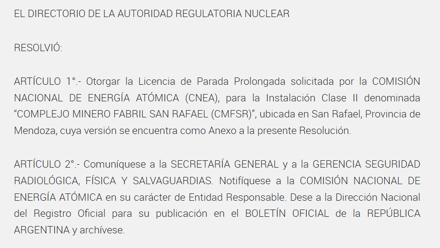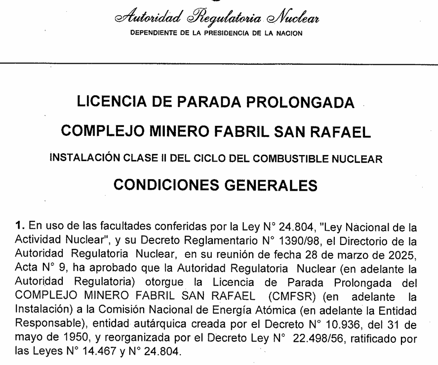 La Autoridad Regulatoria Nuclear (ARN) emitió una resolución en la que autoriza una nueva «licencia por parada prolongada» para las instalaciones del Complejo Minero Fabril San Rafael (CMFSR), ubicado en Sierra Pintada, a pocos kilómetros de la ciudad de San Rafael.