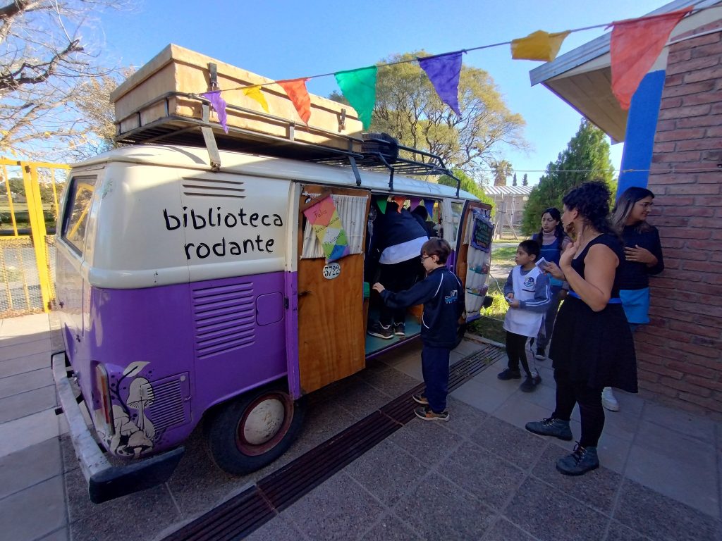 Además de las actividades para las infancias, “Doña Galinda” ofrece talleres para docentes y mediadores culturales, funciones de narración oral, títeres y acciones en espacios públicos. “Si la comunidad lo permite, damos una plaza, abrimos las puertas de la camioneta —que también es mi casa, hace tres años vivo en esta combi— y compartimos con las personas para que puedan entrar a conocer todo el material literario que tenemos”, relató la docente, remarcando la importancia de pensar bibliotecas más allá de las instituciones, en espacios públicos y accesibles.