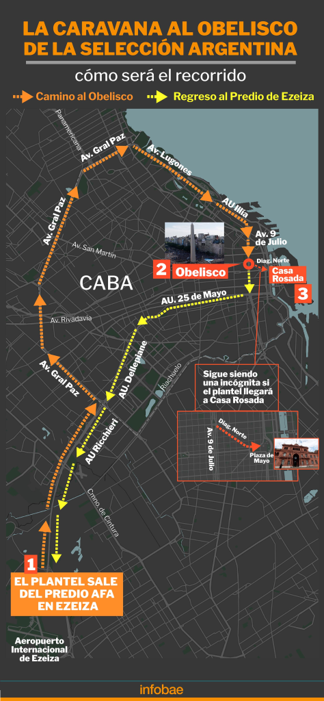 Según se acordó, desde ese lugar partirá el equipo para avanzar en dirección a la Autopista Ricchieri, para luego tomar la Avenida General Paz, continuar por Lugones hasta llegar a 9 de Julio y, de ahí, seguir viaje hacia el Obelisco, donde serán los festejos principales, para posteriormente comenzar su regreso, que será por la avenida la autopista 25 de Mayo, luego por Dellepiane, y la Ricchieri hasta regresar al predio de Ezeiza.