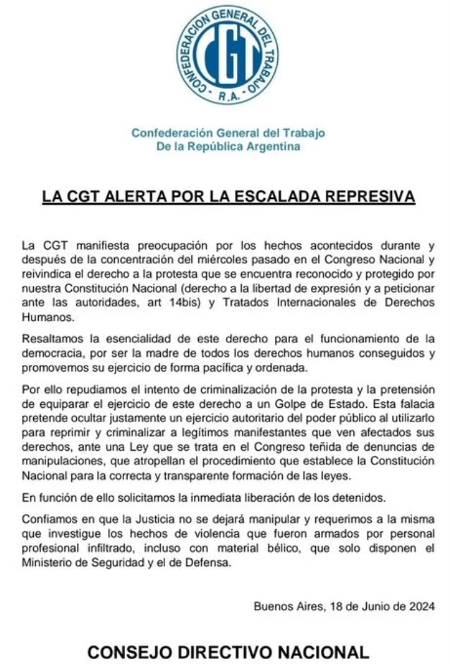«La CGT manifiesta preocupación por los hechos acontecidos durante y después de la concentración del miércoles pasado en el Congreso Nacional y reivindica el derecho a la protesta que se encuentra reconocido y protegido por nuestra Constitución Nacional y Tratados Internacionales de Derechos Humanos», expresó la central sindical en un comunicado.