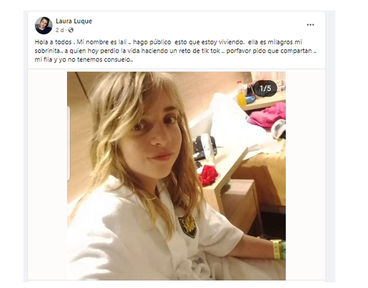 “Hola a todos. Mi nombre es Lali. Hago público esto que estoy viviendo. Ella es Milagros, mi sobrinita, quien hoy (viernes) perdió la vida haciendo un reto de TikTok. Por favor pido que compartan. Mi familia y yo no tenemos consuelo”, publicó la tía de la nena junto a una foto de ella.
