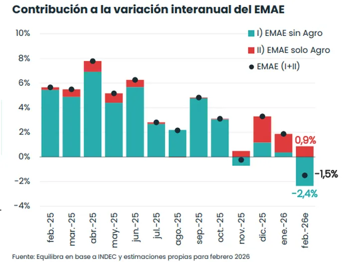El Estimador Mensual de Actividad Económica (EMAE) de la consultora Equilibra se contrajo un 1% respecto de enero (-1,5% interanual), debido íntegramente al retroceso del 1,1% en el EMAE que excluye de la medición al agro (ya que este rubro depende de otros determinantes, como el clima, y suele presentar una mayor volatilidad. Por su parte, el agro no arrojó cambios contra el mes previo; el fin de la cosecha de trigo y la merma en la producción de carne fueron compensados por el buen comienzo de la cosecha de maíz y una mejora en la producción de leche.
