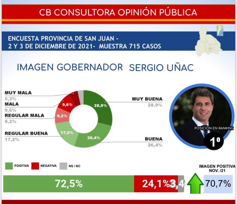 Cristian Buttié, integrante de la consultora CB, brindó declaraciones a FM Vos (94.5) y Diario San Rafael. “Hicimos este estudio entre los días 2 y 5 de diciembre en forma simultánea en todas las provincias; el gobernador de San Juan, Sergio Uñac lidera el ranking con el 72,5% de imagen positiva. Lo sigue Gerardo Morales (Jujuy) con el 71,8 y el tercer lugar lo ocupa Gustavo Valdez (Corrientes) con el 70,6. El gobernador de Mendoza, Rodolfo Suarez, se ubica en el cuarto lugar con una imagen favorable del 70,2 %. Nosotros hacemos una sola pregunta para medir a gobernadores, intendentes y dirigentes nacionales de cada provincia. La pregunta está referida a lo que piensa la gente del encuestado, en términos generales. Sintetizamos en esta consulta las diferentes variables, si no se nos hace muy difícil procesar la información, ya que en Argentina tenemos 24 provincias y la encuesta la hacemos en forma simultánea. Todos los meses repetimos la misma pregunta y esto nos permite evaluar la evolución de esta. Hay gobernadores que miden bien regularmente, tal es el caso de Rodolfo Suarez, porque estructuralmente la provincia no tiene grandes deficiencias, aunque obviamente siempre hay cosas a mejorar. A su vez, hay gobernadores que no miden bien ya que tienen en su provincia deficiencias estructurales, como salud, seguridad (este es el caso de Omar Perotti en Santa Fe) y otros que suman descontento general, como es el caso, por ejemplo, de Santa Cruz. Recordemos que esta provincia tiene ley de lemas y eso hace que Alicia Kirchner sea gobernadora con el 22% de los votos; es decir, que sumó lemas de quienes la acompañaron, y por ende esto hace que se entienda por qué no tiene la imagen de otros gobernadores”.