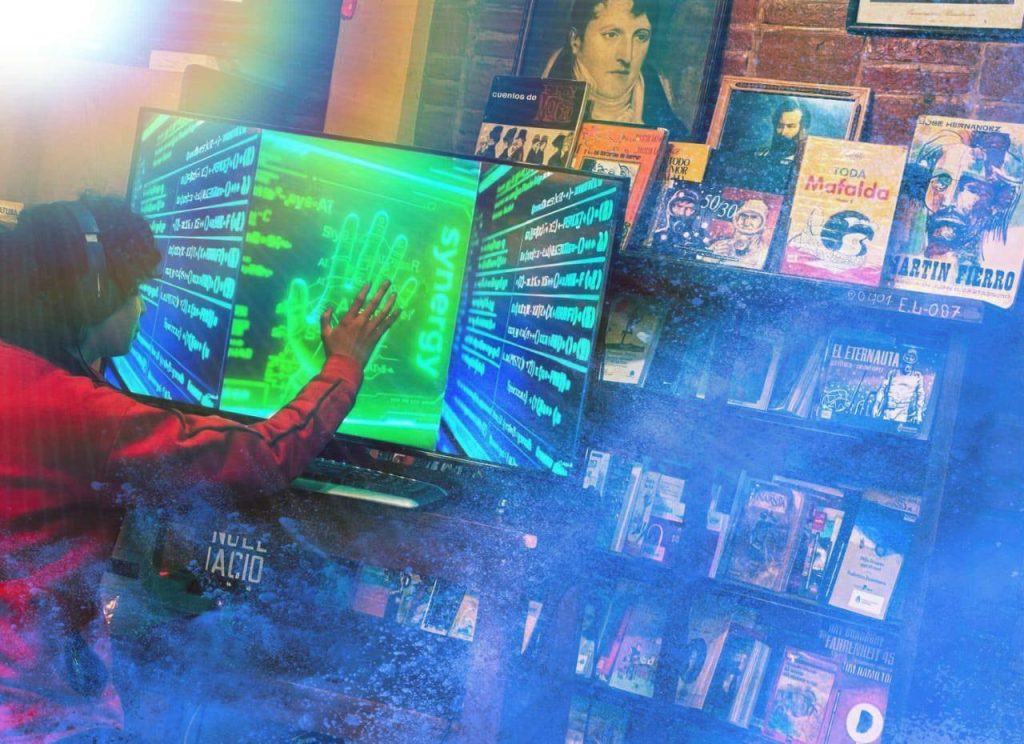 La docente describió que el trabajo comenzó a delinearse hace varios meses. “Por el mes de mayo empezamos un poco a pensar en la idea de la fotografía y ver a la Inteligencia Artificial como un avance”, comentó, en relación con el proceso inicial de intercambio con los estudiantes. Esa etapa incluyó diálogos sobre posibilidades, riesgos y transformaciones tecnológicas. En ese marco surgió la obra finalmente presentada, una imagen construida desde la idea de colaboración entre personas y tecnología. “La foto la titulamos sinergia y la realizamos en la biblioteca de la escuela, donde se muestra en esa escena una alumna frente a la pantalla de la computadora y desde la pantalla de la computadora sale una mano, como ayudándola”, explicó la docente, subrayando que la intención fue transmitir una noción de asistencia, interacción y complementariedad.