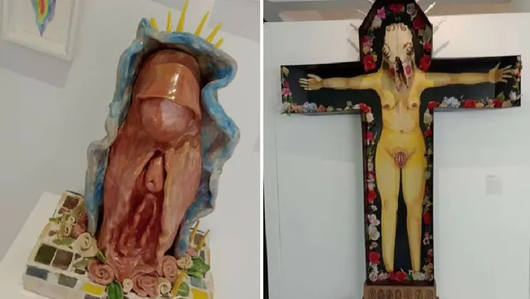 Las obras que generaron controversia muestran la crucifixión de Jesús representada con el cuerpo de una mujer desnuda y una vulva que simula ser una imagen de la Virgen María.