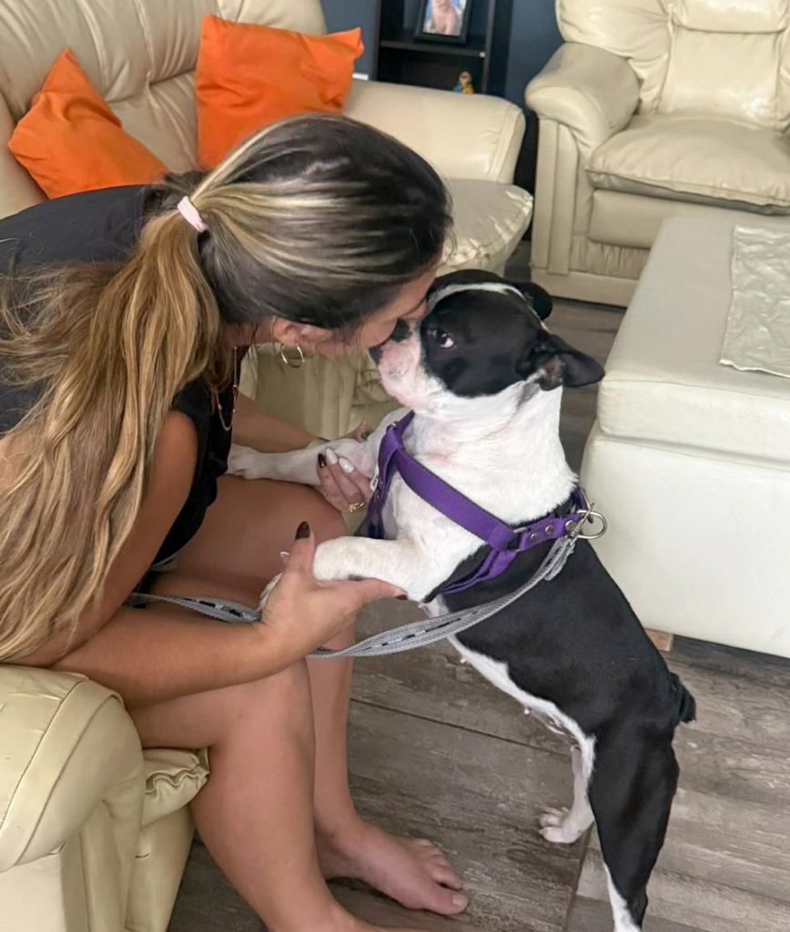 Roma es una perra de raza “Boston Terrier”, pasó más de un año en “manos ajenas” y gracias al compromiso de un vecino que la retiró de una calle muy transitada y al de Teresa que decidió publicar su foto en las redes sociales, el animal volvió a estar rodeada del amor de su familia.
