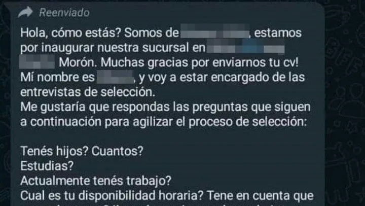 Allí, se lee: “Hola, ¿cómo estás? Estamos por inaugurar nuestra sucursal en Morón. Muchas gracias por enviarnos tu CV. Voy a estar encargado de las entrevistas de selección. Me gustaría que respondas las preguntas que siguen a continuación para agilizar el proceso de selección”.