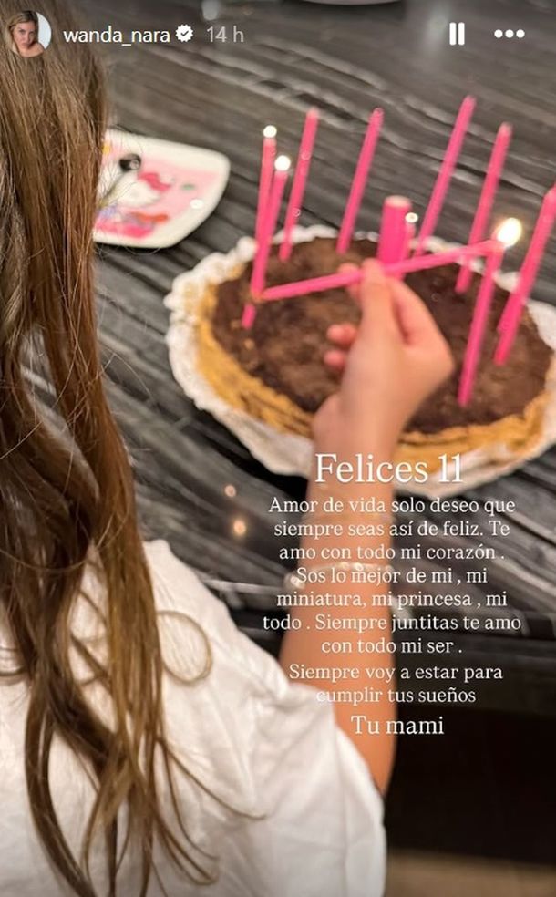 Desde muy temprano, Wanda eligió homenajear a su hija con una publicación en sus historias de Instagram. La imagen mostraba a Francesca de espaldas, frente a su torta de cumpleaños, y estuvo acompañada por un mensaje lleno de amor: «Felices 11. Amor de vida solo deseo que siempre seas así de feliz. Te amo con todo mi corazón. Sos lo mejor de mí, mi miniatura, mi princesa, mi todo».