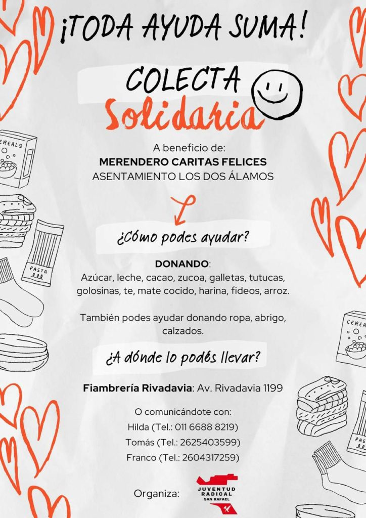 En una época en la que se intensifica la necesidad de comedores y merenderos, desde la Juventud Radical invitan a colaborar con el merendero “Caritas Felices”, mediante una colecta que desarrollarán. Franco Mariotti, quien forma parte de la organización, habló al respecto con FM Vos (94.5) y con Diario San Rafael.