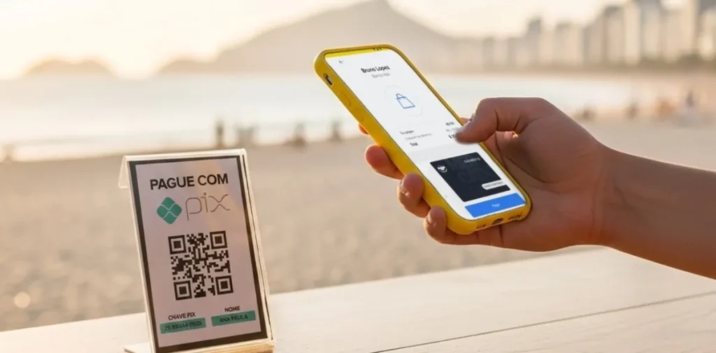 Creado por el Banco Central de Brasil, PIX es un método de pago instantáneo que opera las 24 horas y que hoy domina el comercio cotidiano brasileño. Puede utilizarse en tiendas, shoppings, ferias, taxis y puestos playeros.