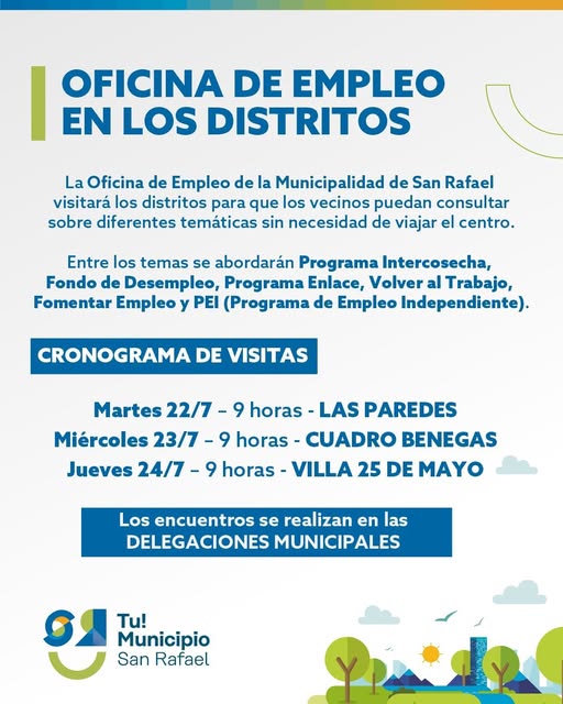 Con el objetivo de descentralizar la atención y facilitar el acceso a programas de empleo y capacitación, la Oficina de Empleo de la Municipalidad de San Rafael ha iniciado un cronograma de visitas a los distritos. Así lo anunció Fabiana Esperanza, titular de la dependencia, quien detalló los días y lugares donde los equipos estarán disponibles para atender a los vecinos.