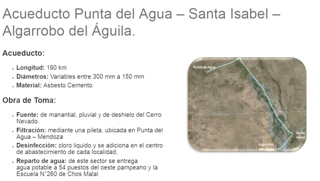 Diario San Rafael del domingo 10 de abril 2022, en su página 4 da cuenta de un justo reclamo de los vecinos de Punta del Agua, para exigir a la provincia de La Pampa una regalía por el agua mineral que se les entrega desde el año 1995 para abastecer con agua potable las localidades de Santa Isabel y Algarrobo del Águila, con unos 6.000 habitantes.