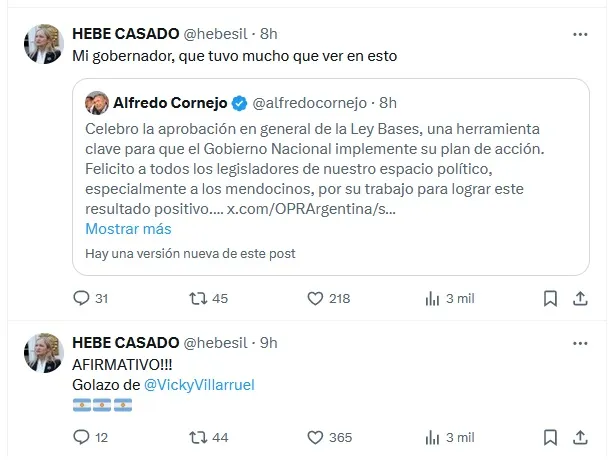 “¡Afirmativo! Golazo de Victoria Villaruel”, posteó Casado. Luego, al replicar el mensaje de Cornejo, resaltó: “Mi gobernador, que tuvo mucho que ver en esto”.