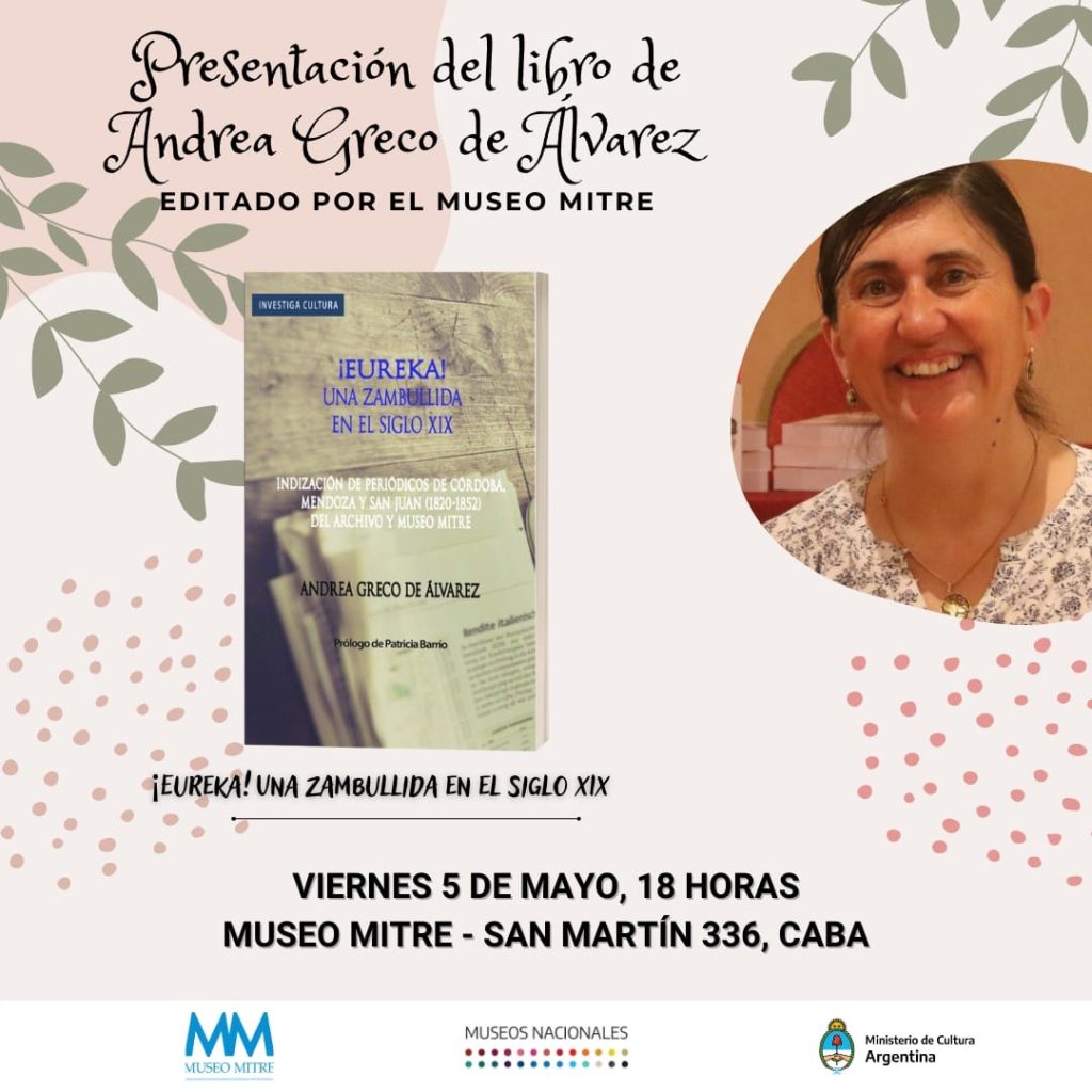 “¡Eureka! Una zambullida en el siglo XIX” es un trabajo de catalogación e indización de periódicos pertenecientes a los fondos patrimoniales del Museo Mitre, desarrollado por esa investigadora. Esto ha sido realizado gracias a una beca concursada en la Convocatoria Investiga Cultura 2019-2020 de la Coordinación de Investigación Cultural de la Secretaría de Patrimonio, para desarrollar una investigación en museos y archivos nacionales. “La idea de ponerle ese título, ‘¡Eureka!’ tiene que ver con aquello que cuenta de la antigüedad Marco Vitruvio, el gran arquitecto, cuando nos cuenta que Arquímedes cuando descubrió el principio que conocemos como ‘Principio de Arquímedes’, saltó de la bañera lleno de alegría y gritó ‘¡Eureka!’ porque había descubierto el principio”, dijo y agregó que la idea de ponerle ese título al libro, nació porque “hay un historiador inglés, que dice que la lectura de periódicos antiguos es como un ejercicio de inmersión, o sea, como meterse en una bañera o sumergirse en la época, porque no sólo podemos saber lo que pasó sino que nos permite hasta recuperar las palabras y el lenguaje técnico de la época, entender cuáles eran los conceptos clave, los problemas del momento, entonces por eso realmente navegaron en la lectura de los periódicos del siglo XIX nos permiten no sólo recuperar datos de los acontecimientos, sino nombres, conceptos, ideas, procesos del pasado, el éxito de la época y los conceptos clave”.