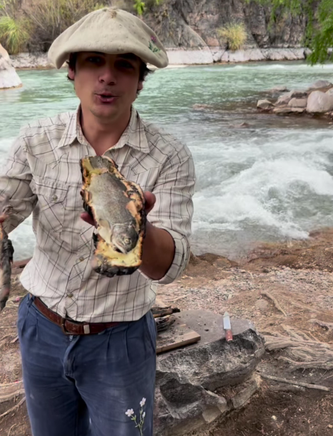 “Alguna vez viste, probaste o escuchaste trucha a la masa. Hoy te muestro como hacerla acá”, arranca el video de @chefsale__ instalado a la vera del Río Atuel en Valle Grande.