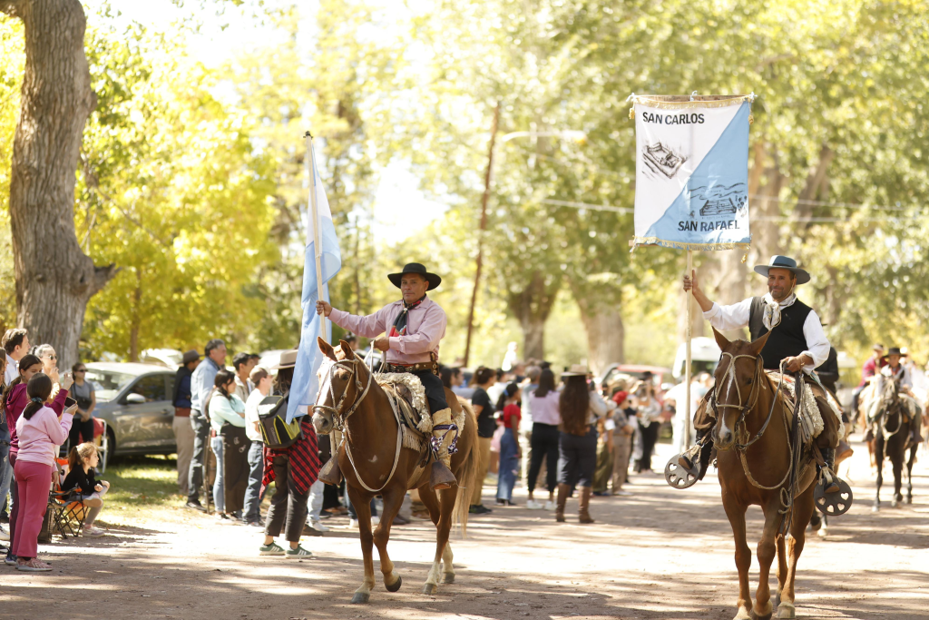 Durante el acto se entregaron reconocimientos a vecinos destacados y representantes de entidades intermedias del distrito. Como cierre de la actividad protocolar, se realizó el tradicional desfile que encabezó la Banda de Música de la Policía, seguida por Banderas de Ceremonia de Fuerzas Armadas, instituciones educativas, entidades del distrito y el cierre de asociaciones tradicionalistas que cumplieron con la cabalgata que une los fuertes de San Carlos y San Rafael.