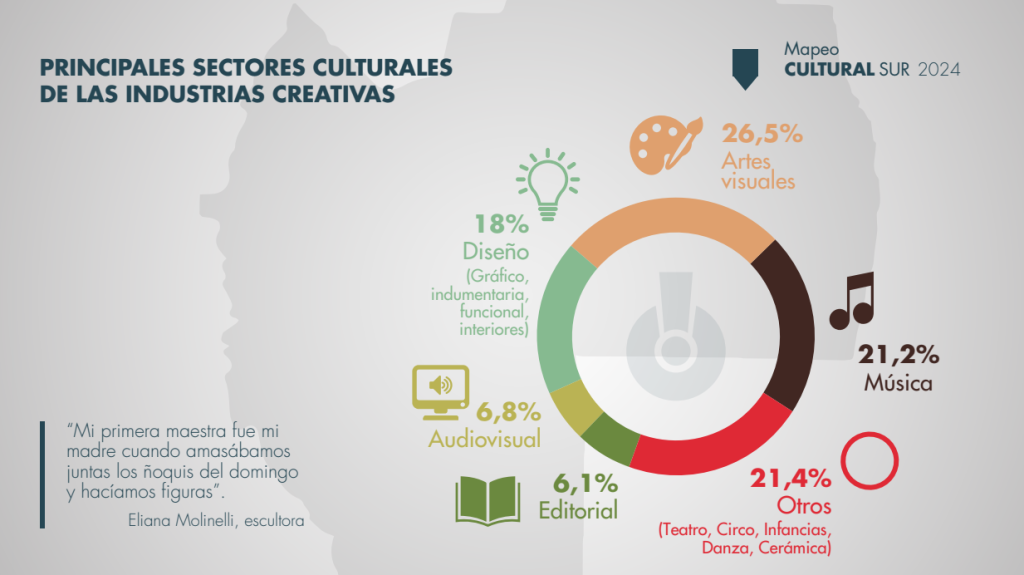 Los principales sectores culturales de las industrias creativas son el diseño (25,5%); las artes visuales (19%); la música (14,6%); y la danza, el folclore y el tango (9,5%).