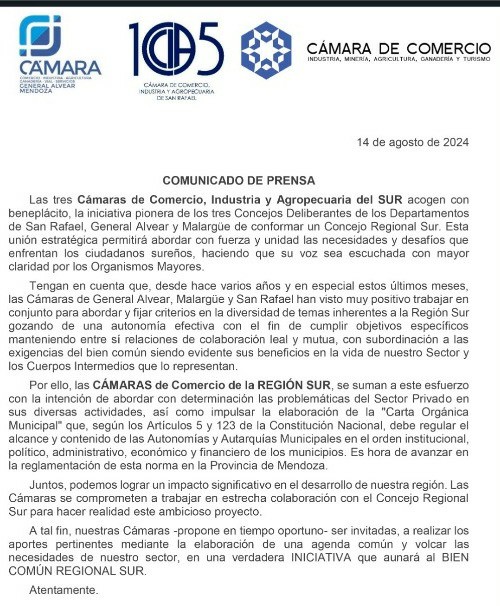 Recientemente, las tres Cámaras de Comercio de los departamentos de San Rafael, General Alvear y Malargüe han manifestado su respaldo al reciente acuerdo de los Concejos Deliberantes de estos municipios para formar un Concejo Regional Sur.