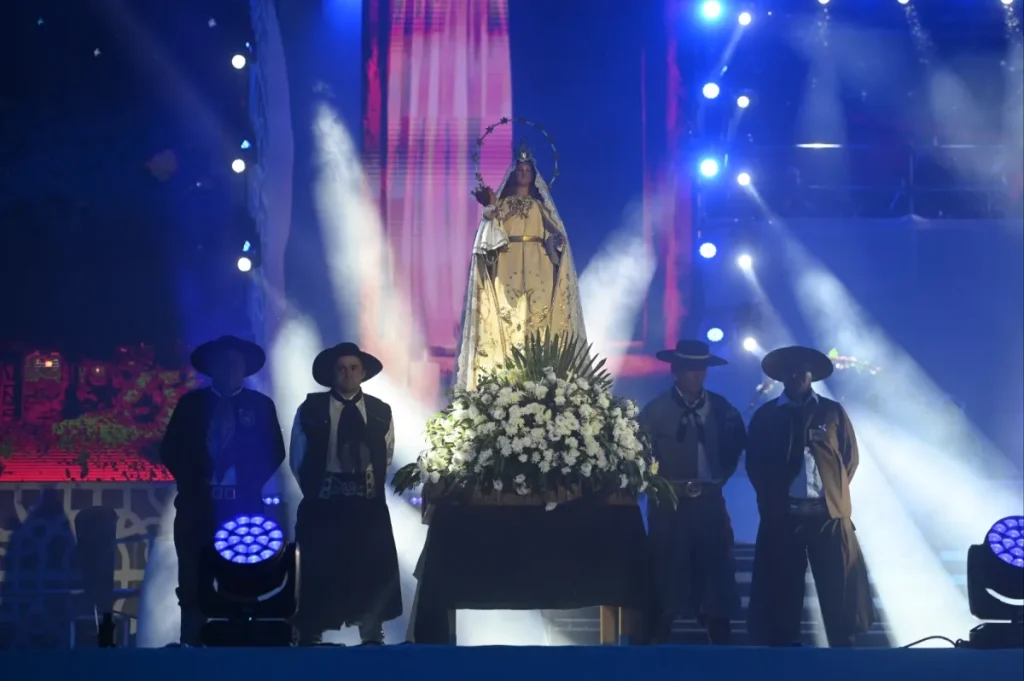 Uno de los momentos más emotivos fue la llegada en procesión de la Virgen de la Carrodilla, acompañada por cosechadores y asociaciones gauchas, en un clima de recogimiento y devoción popular. La puesta también evocó las adversidades que enfrenta la producción, como tormentas y heladas, resaltando la fortaleza del pueblo mendocino ante cada desafío.