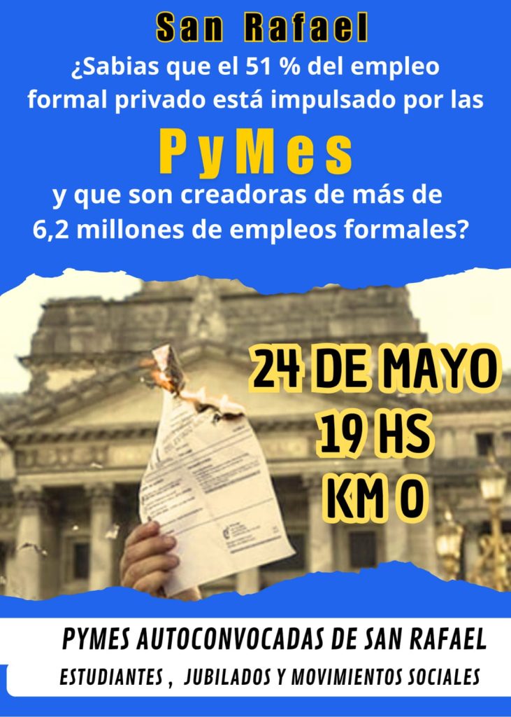 Así como días atrás varias agrupaciones PYME de Argentina se presentaron en el Congreso marcando su rechazo al proyecto y su preocupación por la pérdida de competitividad, a nivel local se están reuniendo en un grupo denominado “PYMES Autoconvocadas de San Rafael” y ya anunciaron un reclamo en el Kilómetro Cero.