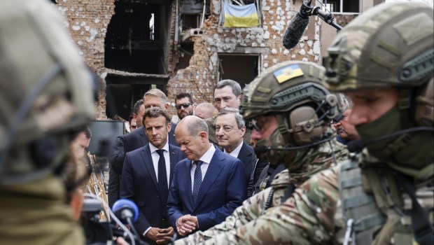 Los presidentes de Francia, Emmanuel Macron, y de Rumania, Klaus Iohannis; el canciller alemán, Olaf Scholz, y el jefe del Gobierno italiano, Mario Draghi, llegaron hoy de manera imprevista a Ucrania y visitaron la devastada ciudad de Irpin, en las afueras de Kiev, donde se puede ver el «heroísmo» de los ucranianos, de acuerdo con el comentario del líder francés.