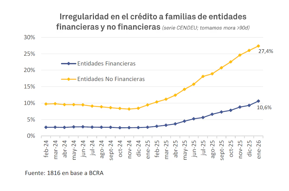 La consultora EcoGo relevó que el nivel de irregularidad en las carteras de crédito no bancario llegó a 23,9% en enero de 2026. El fenómeno no se aisló a un segmento puntual, sino que afectó transversalmente a las principales entidades del sector, tanto fintechs como financieras tradicionales no bancarias. El informe indica que “casi cuatro veces la irregularidad del crédito total del sistema financiero y 2,4 veces la del crédito para consumo bancario de las familias”.