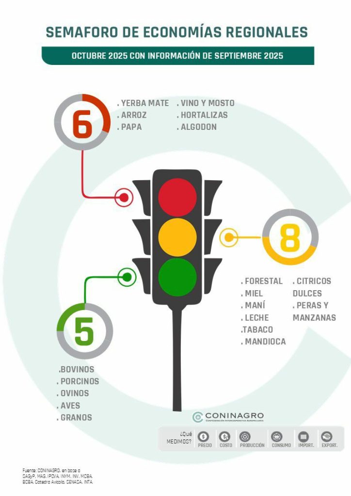 El monitoreo mensual de CONINAGRO, conocido como el “Semáforo de Economías Regionales”, se ha consolidado como el reflejo más sintético y claro de la situación que atraviesan los productores del interior del país. En su última edición, el informe, que analiza 19 economías distintas, arrojó un diagnóstico de creciente dificultad: solo cinco actividades están en estado favorable («verde»), mientras que la mayoría se divide entre la «alerta» («amarillo») y la «crisis» («rojo»).