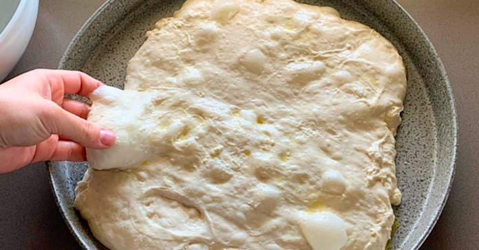 Al día siguiente, saca la masa de la nevera y déjala a temperatura ambiente durante al menos 4 horas, donde empezarán a formarse burbujas. Extiéndalo en una bandeja para hornear engrasada, ampliándolo un poco suavemente; cada vez con intervalos de 10 minutos.