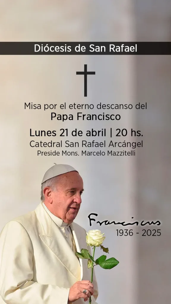 Desde la Oficina de Prensa del Obispado de San Rafael se informa que este lunes, a las 20 hs. en la Catedral San Rafael Arcángel tendrá lugar la Santa Misa para rogar por el eterno descanso del Santo Padre Francisco.