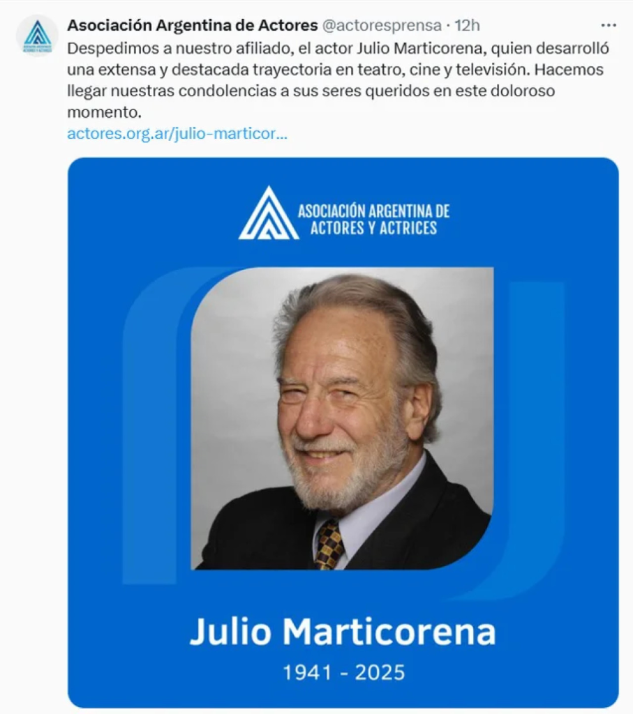 “Despedimos a nuestro afiliado, el actor Julio Marticorena, quien desarrolló una extensa y destacada trayectoria en teatro, cine y televisión. Hacemos llegar nuestras condolencias a sus seres queridos en este doloroso momento”, escribió la Asociación Argentina de Actores en su cuenta oficial de X.