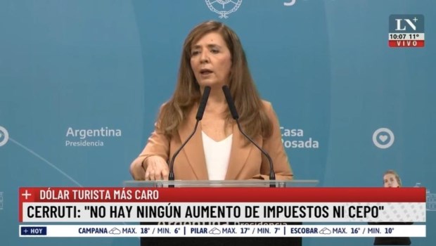 La portavoz de la Presidencia, Gabriela Cerruti, aseguró ayer que «no hay ningún aumento de impuestos ni ningún cepo», en referencia a la resolución general de la AFIP que «lo único que estableció es una mayor percepción del adelanto de Ganancias» del 35% al 45% para las operaciones con moneda extranjera en el exterior.