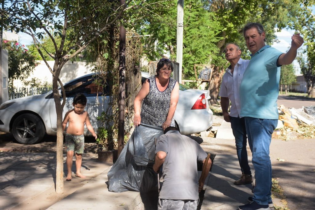 Durante una recorrida por calle Rodríguez Peña, en el barrio Constitución, el jefe comunal decidió destacar personalmente el gesto de un vecino, quien pala en mano, decidió limpiar la acequia para embolsar las hojas que había en su interior.