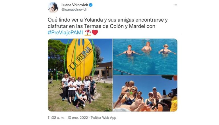 “Qué lindo ver a Yolanda y sus amigas encontrarse y disfrutar en las Termas de Colón y Mardel con #PreViajePAMI”, decía el mensaje publicado el 10 de enero.