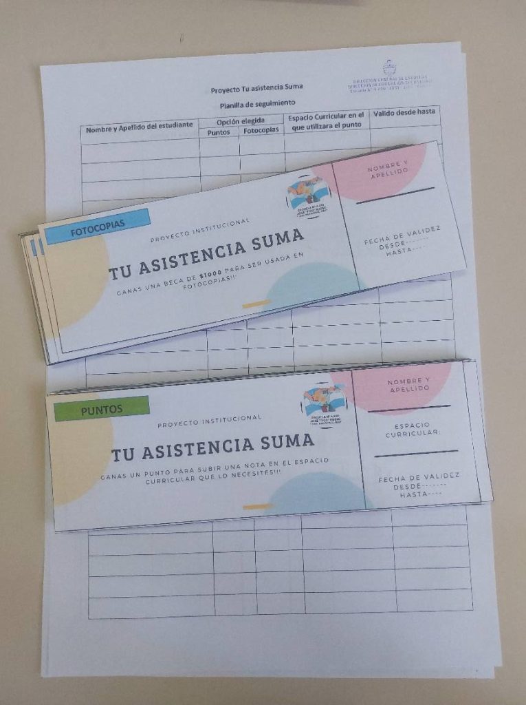 “Este proyecto tiene como fin estimular la asistencia diaria a clases. El estudiante que completa dos semanas de asistencia consecutiva obtiene, a elección, un vale de 1000 pesos para fotocopias o bien un punto adicional en alguna nota de proceso del espacio curricular que elija”, explicaron desde la institución.