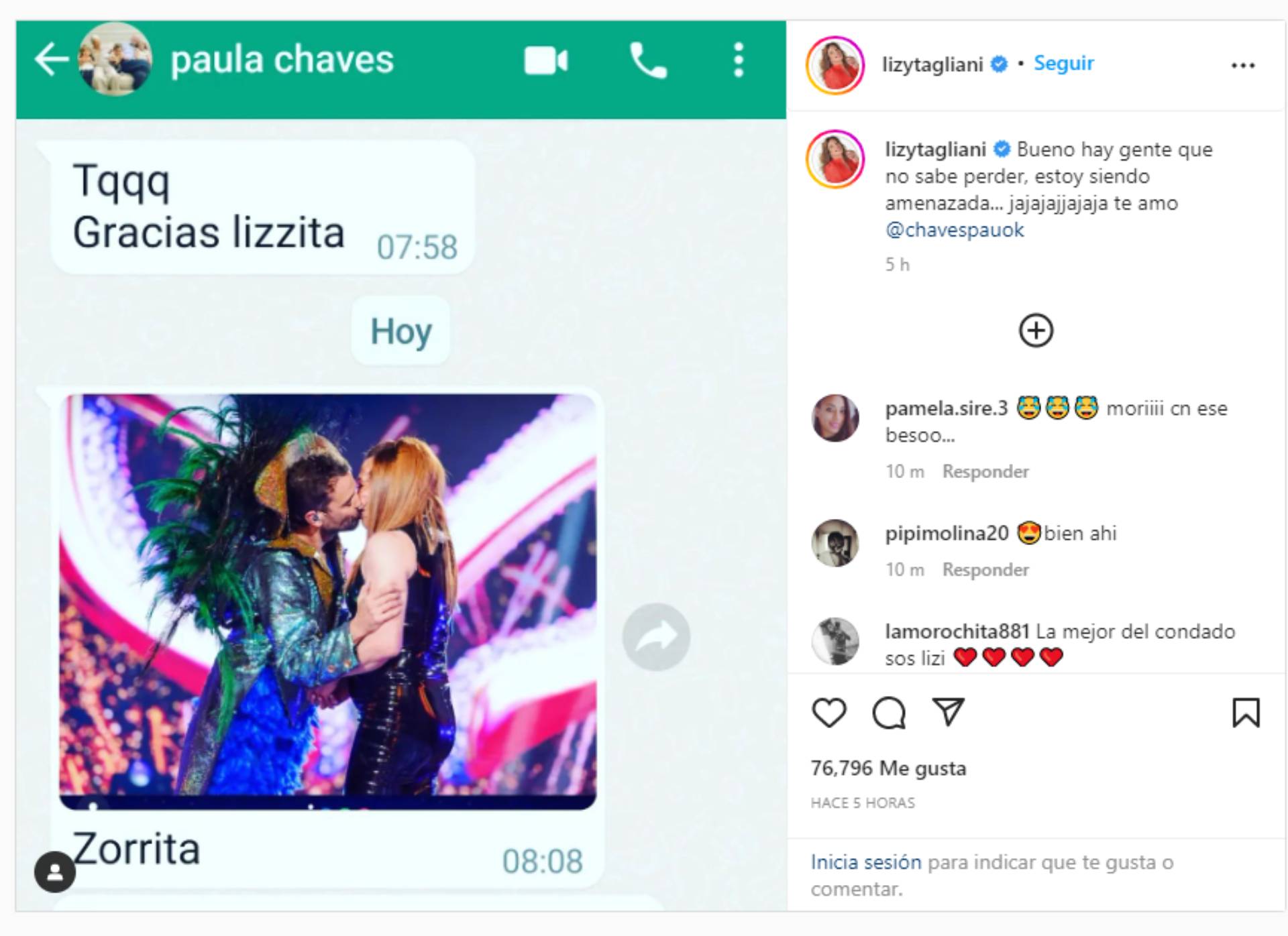 La hermana de Zaira Nara lanzó: “¡Amiga traicionera, eh!”. Finalmente, el actor y la investigadora se dieron un beso que generó revuelo en las redes sociales. Al enterarse de lo ocurrido, Paula Chaves le mandó una captura del piquito por WhatsApp a Lizy. “Zorrita”, le dijo la modelo. Más tarde, la humorista compartió en su Instagram una imagen del mensajito y escribió: “Bueno hay gente que no sabe perder, estoy siendo amenazada… jajajajjajaja te amo @chavespauok”.