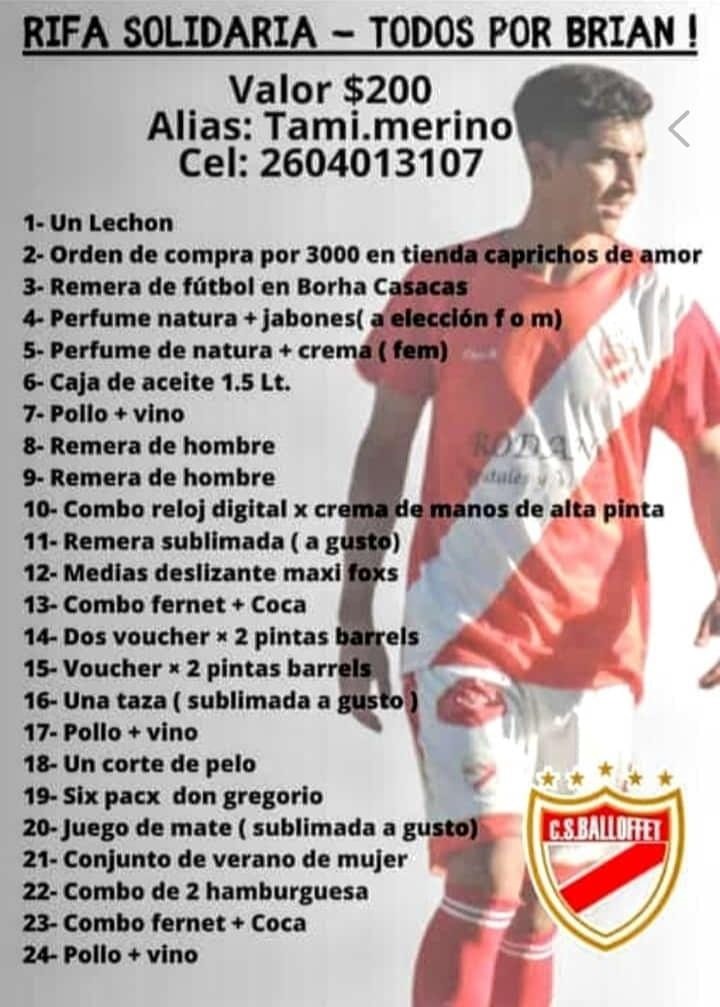 Brian Chaine (23) es jugador de fútbol en el Club Balloffet. Hace dos semanas, mientras su equipo jugaba contra Huracán, sufrió una lesión que le causó que se le desplazara la clavícula. Deberá someterse a una cirugía muy costosa, por lo que pide ayuda a la comunidad, a la que invita a participar de una rifa.
