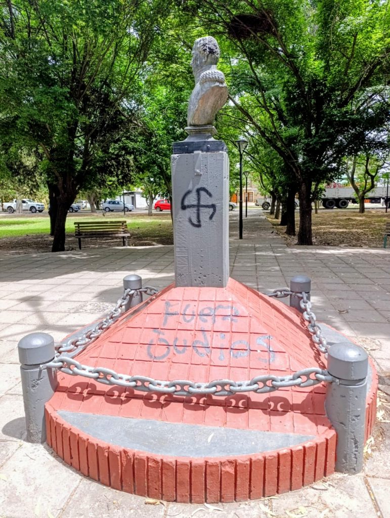 Vecinos del barrio Unimev, en las inmediaciones de Plaza Almirante Brown, que se ubica sobre avenida Quiroga al 2155, denunciaron la aparición hoy sábado de pintadas con contenidos discriminatorios y mensajes de odio en el monumento instaurado en el centro de la plaza en honor al prócer. Entre los grafitis se registraron expresiones de carácter antisemita dirigidas a la comunidad judía y una cruz esvástica pintadas con aerosol.
