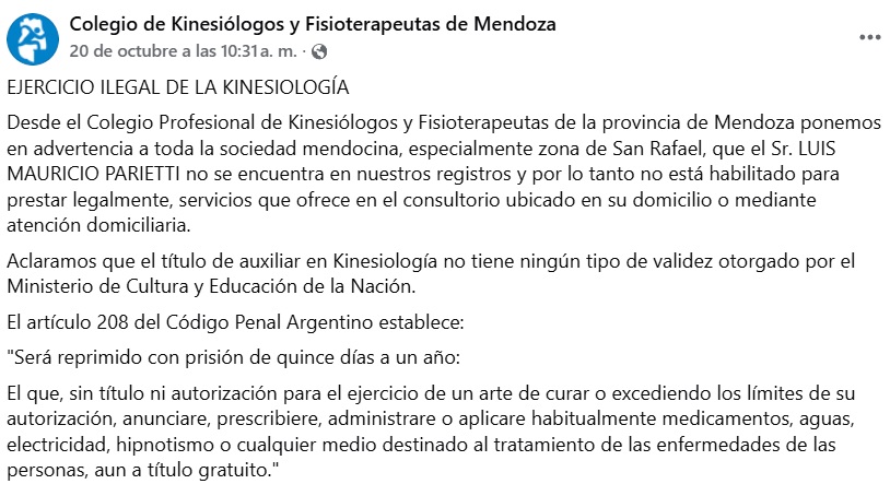 A través de un comunicado difundido en sus redes sociales, la institución advirtió sobre la situación del señor Luis Mauricio Parietti, quien —según expresaron— “no se encuentra en los registros del Colegio y, por lo tanto, no está habilitado para prestar servicios de Kinesiología en su consultorio ni mediante atención domiciliaria”.
