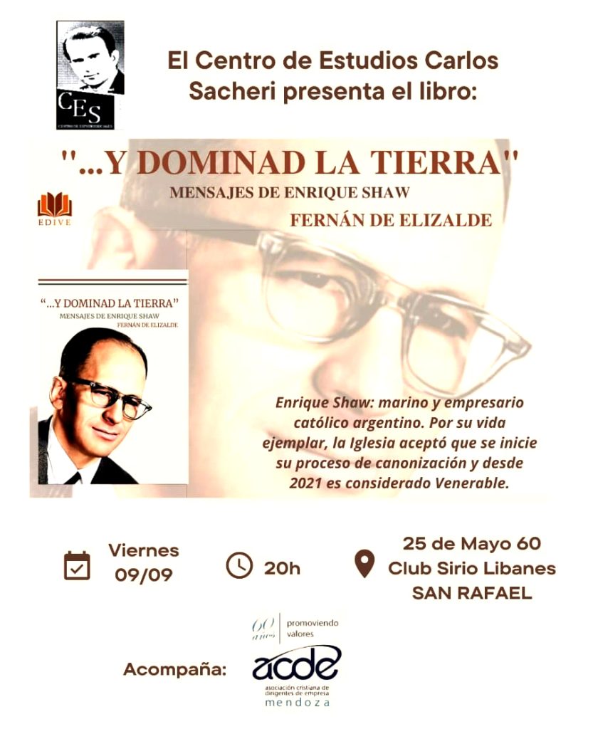 El Centro de Estudios Sociales Carlos Sacheri, acompañados de Ac de Mendoza, invita a la presentación del libro “Y dominad la tierra”, mensajes de Enrique Shaw de Fernán de Elizalde. El libro será presentado por el profesor Darío Olarte, el Ingeniero Gustavo Lombard y la participación del autor, Fernán de Elizalde. El lugar elegido es el Club Sirio Libanés (25 de Mayo 60), este viernes a las 20 hs con entrada libre y gratuita.