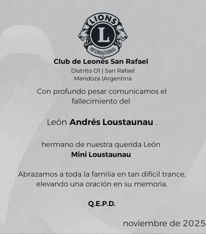 La comunidad de San Rafael despide con hondo pesar a Andrés Loustaunau, reconocido empresario local y activo colaborador del Club de Leones durante muchos años. Su compromiso con las causas solidarias, su vocación de servicio y su cercanía con cada proyecto comunitario lo convirtieron en un referente querido y respetado.
