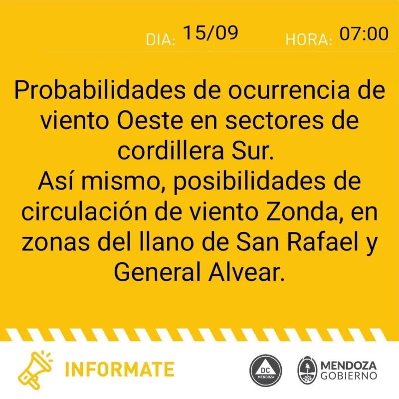 Por su parte, Defensa Civil, alertó probabilidad de Zonda, afectando zonas del llano de Malargüe.
