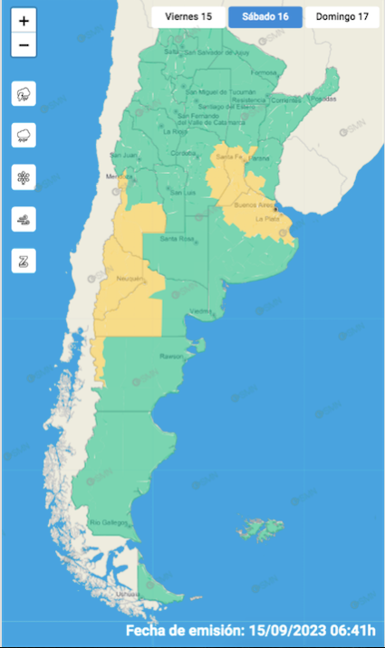El Servicio Meteorológico Nacional (SMN) indica, además, doble alerta amarilla y naranja por Zonda en precordillera y el Sur provincial.