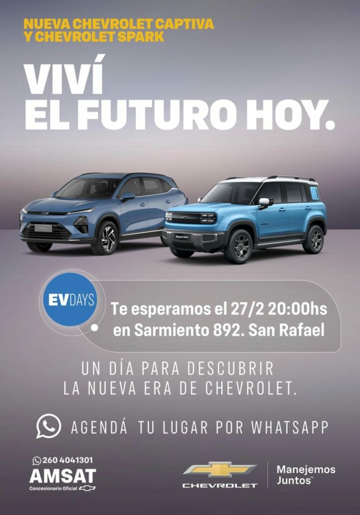 La concesionaria AMSAT Chevrolet, Balloffet y Sarmiento, realizará este fin de semana un evento abierto al público con test drive y presentación de modelos eléctricos e híbridos de la marca Chevrolet. La actividad busca acercar a los vecinos de San Rafael las nuevas tecnologías que ya se utilizan a nivel mundial.